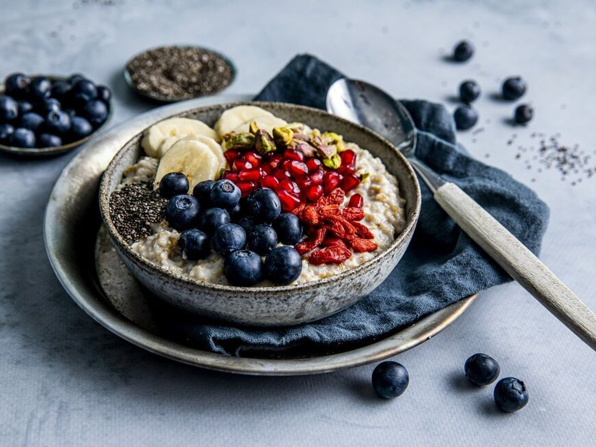 - Fordel grøten i to skåler og topp med blåbær, bananskiver, hakkede pistasjnøtter, gojibær, granateplekjerner og chiafrø.