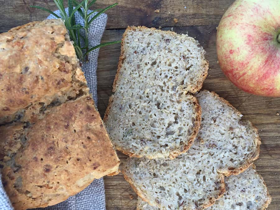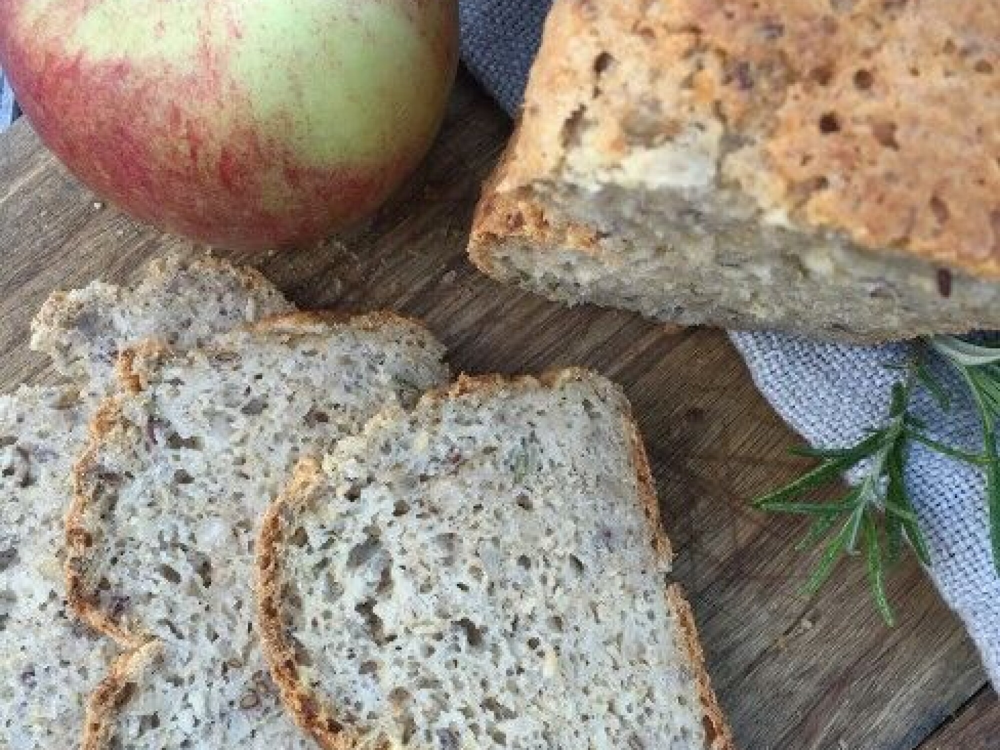 Bland kesam og vann fingervarmt og tilsett olje før du tilsetter brødmiks, tørrgjær, eple og eventuelt rosmarin. Vil du unngå melk så erstatter du kesam med soyayoghurt. Bland alt godt i kjøkkenmaskinen, 5-10 min. Kle en 1 liters brødform med bakepapir og hell deigen i. Sett til heving i 30 min. Sett stekeovnen på 200 grader og stek så i ca 45 min – følg med på steketiden.