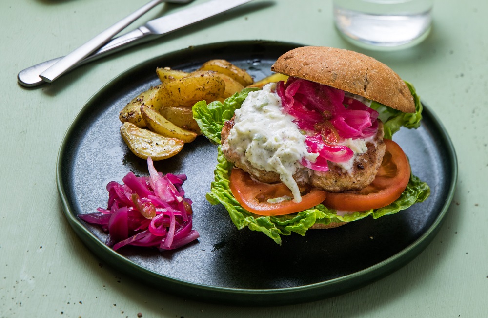 - Lamme- og svineburger med epletzatziki og rødløk- og chilirellish
