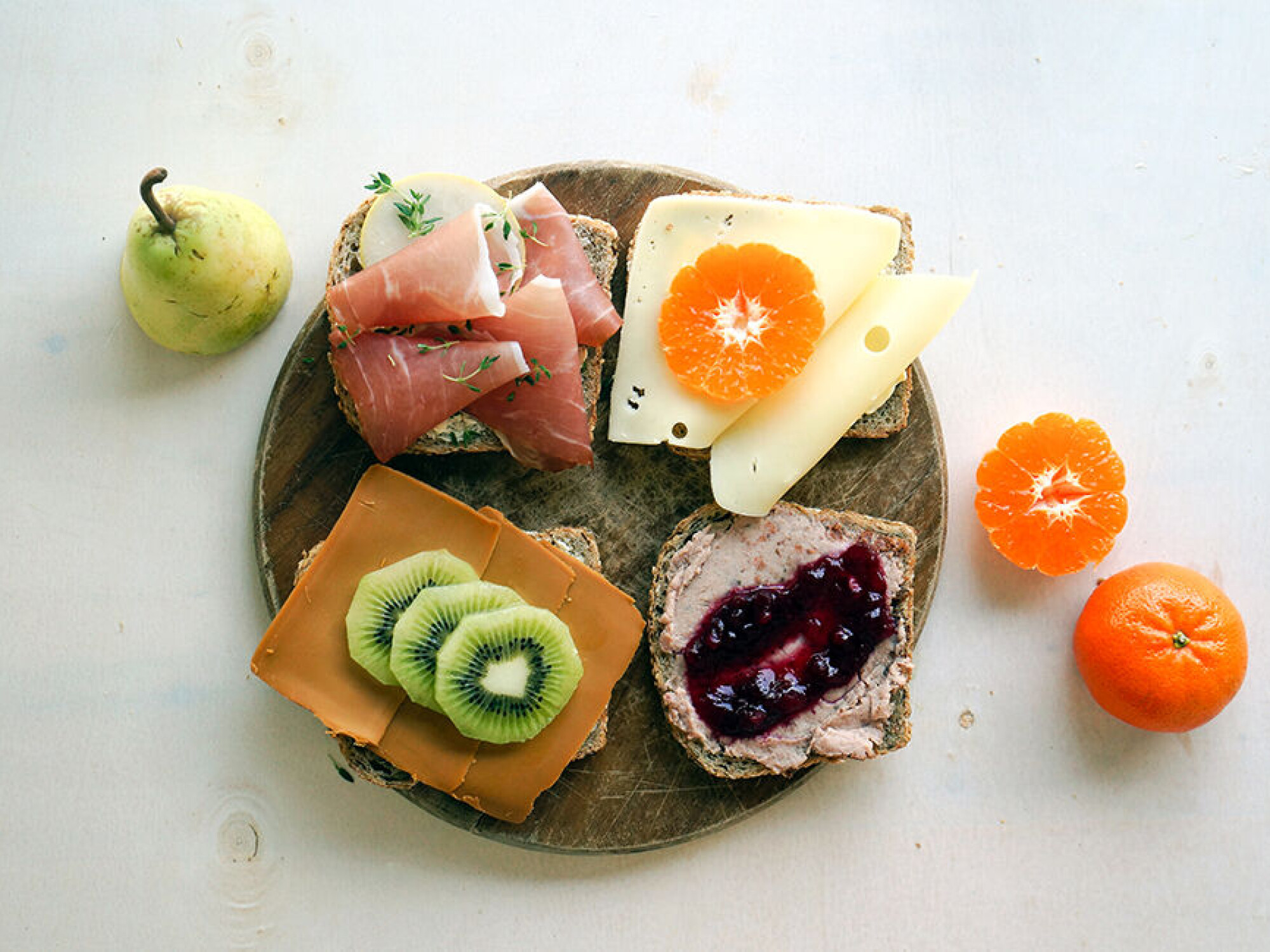 Leverpostei med tyttebærsyltetøy; den søte, litt bitre smaken av tyttebær passer godt med den krydrede kjøttsmaken i leverposteien. Brunost med kiwi; kiwi er akkurat passe søt og går godt med den runde smaken i brunosten. Gulost med klementin; den syrlige friskheten i klementinen passer utmerket til den fyldige gulostsmaken. Spekeskinke med pære og timian.