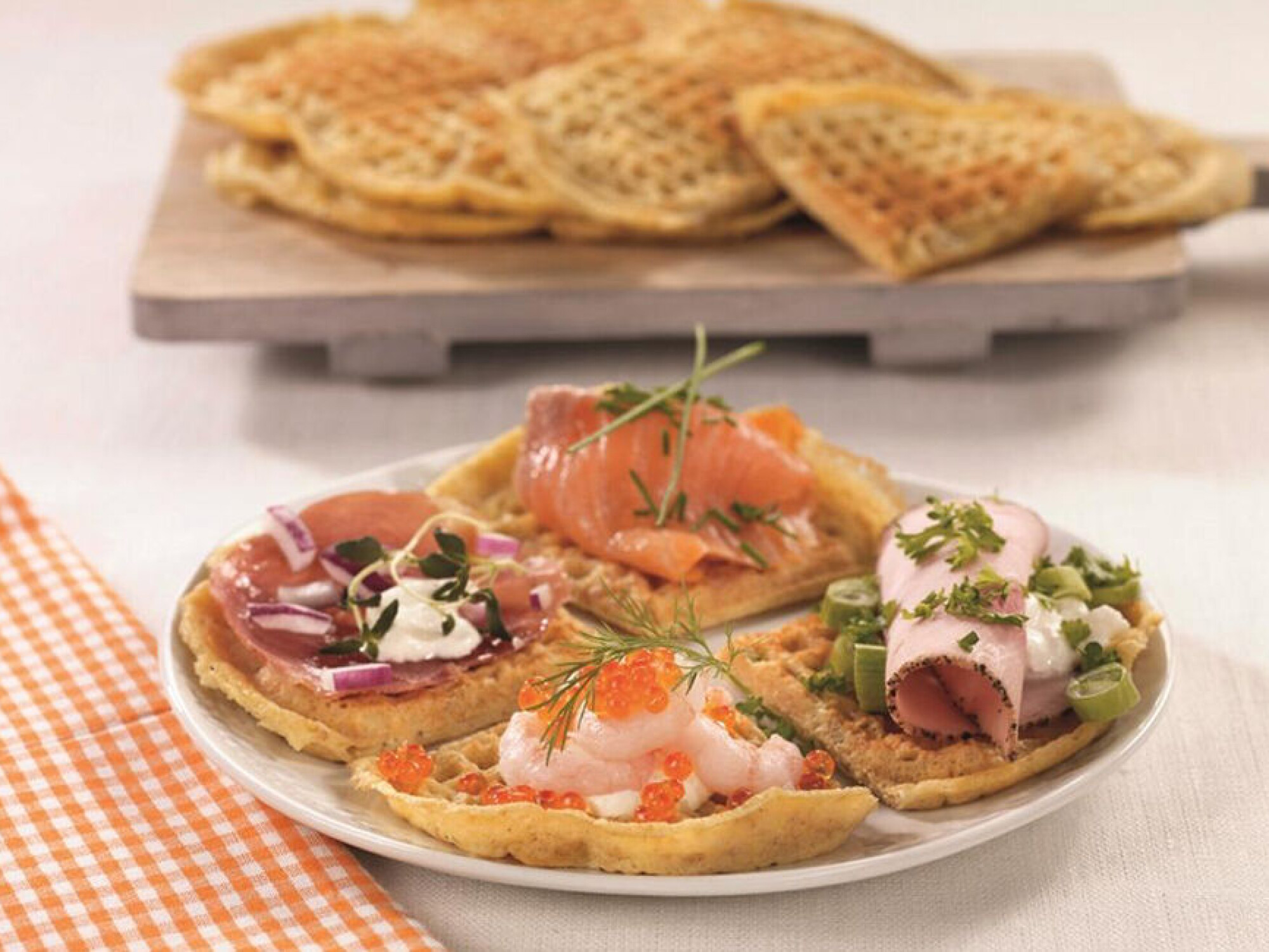 - Salt pålegg smaker også godt på vaffel. Prøv gjerne røkelaks, reker, kokt skinke, spekeskinke, egg og diverse smøreoster som topping.