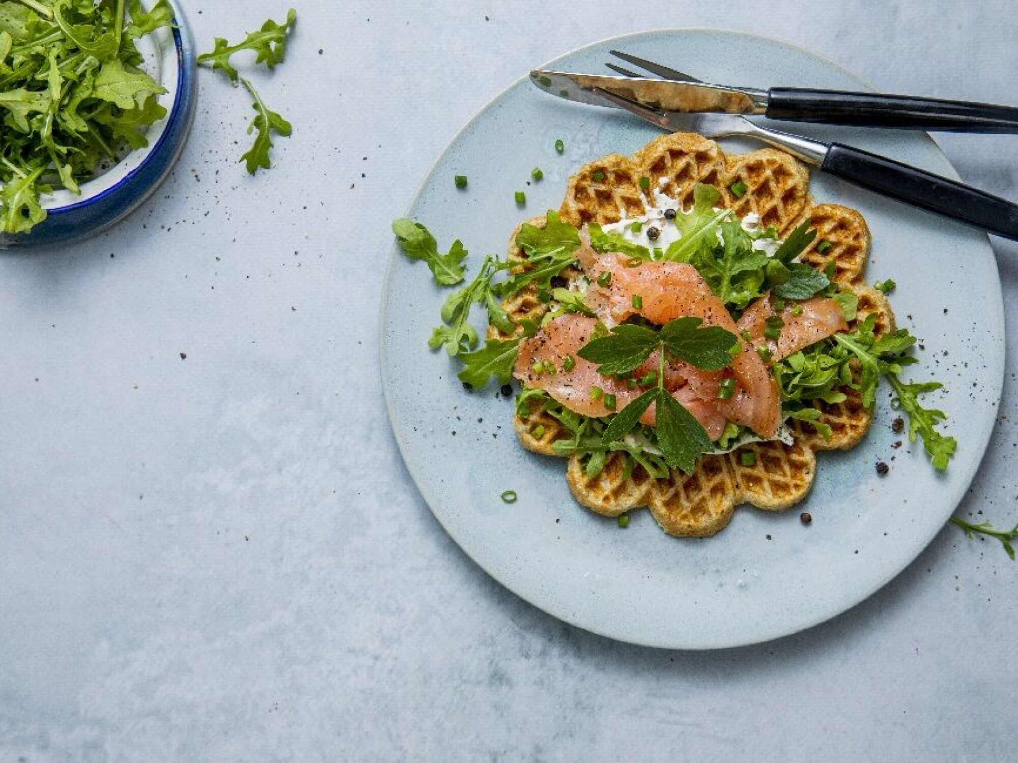 - Topp vaflene med Śnøfrisk, ruccola og laks, og nyt!