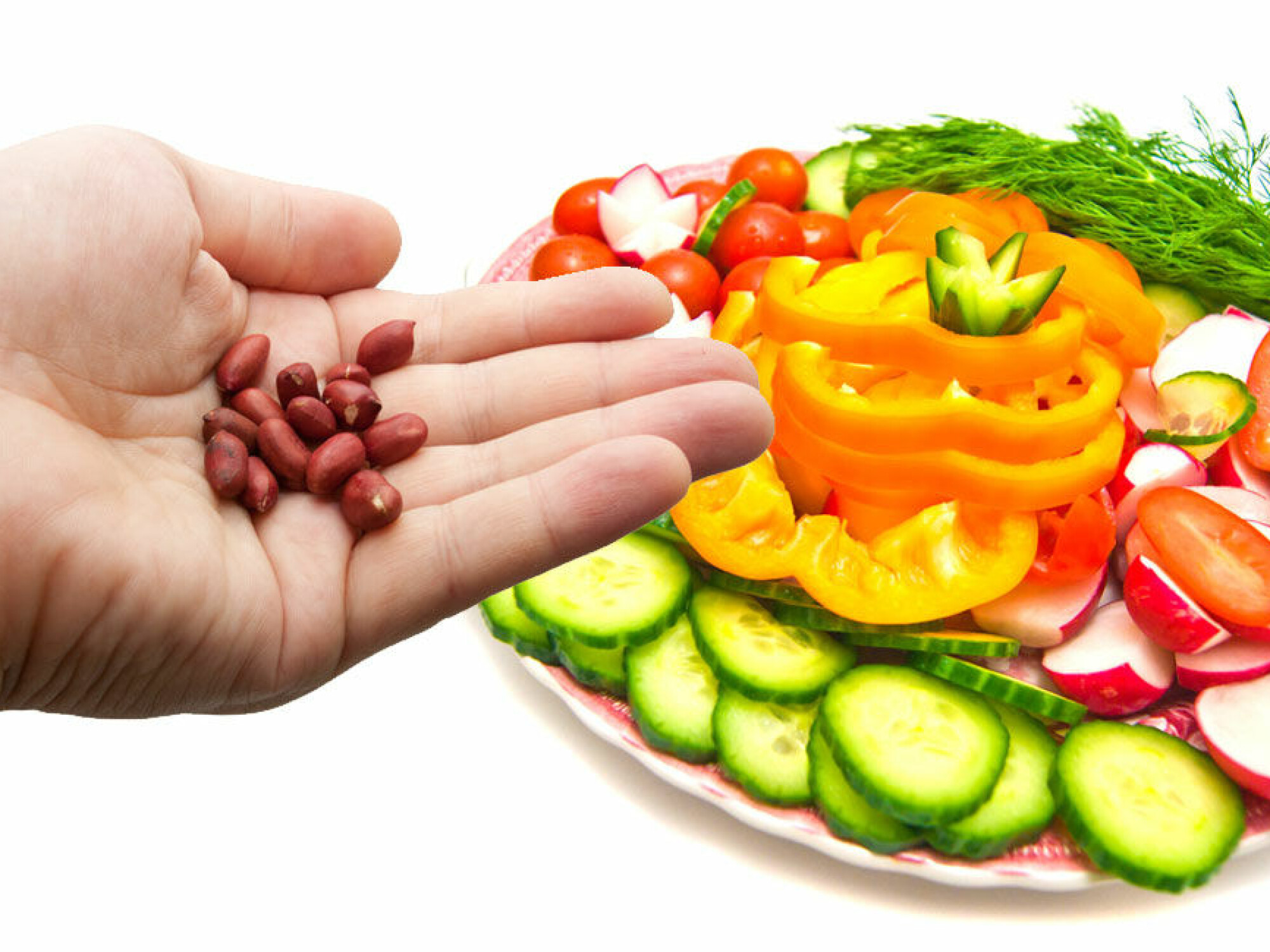 Mer frukt og grønt. Sakker du også akterut her? Her igjen er hovedfokuset rettet mot de unge, og regjeringen vil øke deres inntak av frukt og grønt med 50 prosent. Det er bare om lag 14 prosent av voksne som spiser anbefalt mengde grønnsaker. Hvordan ligger du an i forhold til fem om dagen? Se Grete Roedes matvettregel #6 – Ha frukt og grønnsaker til alle måltider