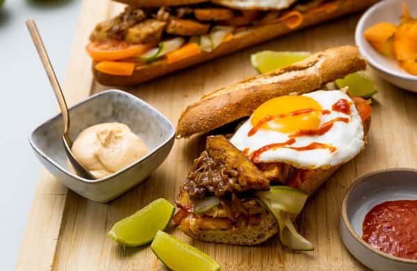 Banh mi – grov vietnamesisk bagett med tofu, speilegg og chilimajones