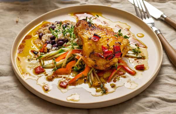 Server jamaikansk Jerk Chicken og sjyen fra formen med bønneris og eple- og agurksalat.