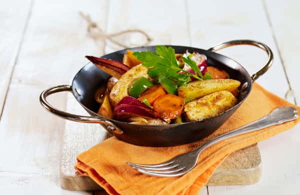 - Stek potet- og grønnsakene i samme panne i ca 5 minutter under omrøring. Tilsett ferdig utblandet grønnsaksbuljong og la potetene og grønnsakene koke under lokk i 10-15 minutter til potetene er møre.