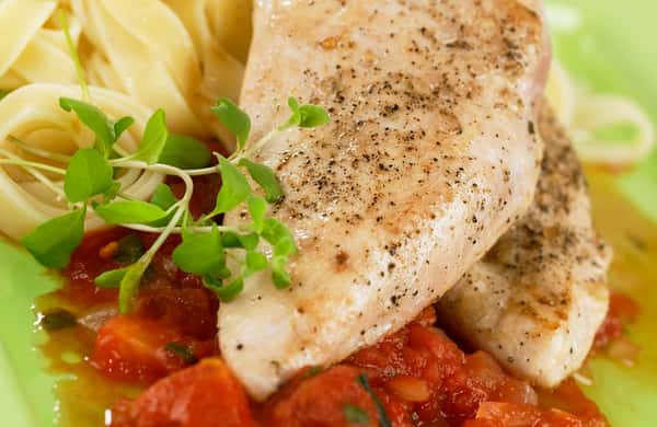 Server kyllingfiletene med fullkornspasta og tomatsaus.