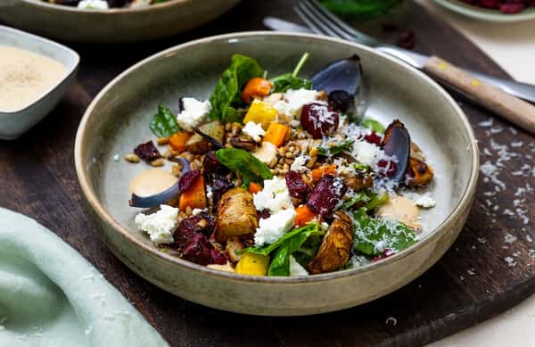 - Skyll og tørk spinaten. Bland sammen de bakte grønnsakene, kjernene, rødløken, spinaten, tobladssalaten og litt av steinsoppdressingen på stekebrettet. Bryt og fordel middagsosten, resten av Grande Premium-osten over, og strø tranebærene på toppen. Server resten av steinsoppdressingen ved siden av.