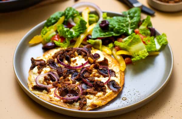 Pitapizza er en ekte hverdagshelt, superrask å lage når det er litt ekstra travelt. Stekt sopp, skjørost og tomatpesto er utradisjonell og nydelig topping.
