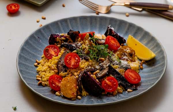 Risoni med timianstekt aromasopp, ovnsbakte beter og Grande Premium
